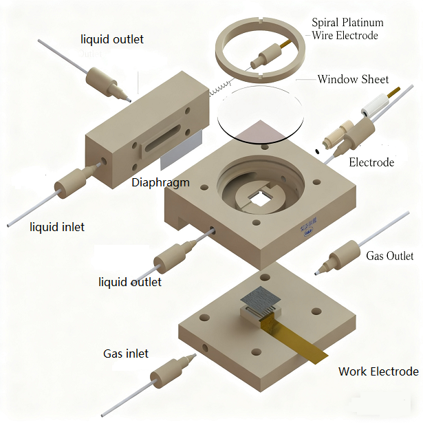 The distance from the surface of the working electrode to the lower surface of the window plate is 2.5mm. Standard carbon paper containing platinum counter electrode and silver chloride reference working electrode shall be provided.